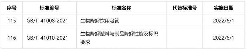 2021年11月26日,國家市場監督管理總局、國家標準化管理委員會發布公告,《GB/T 41010-2021 生物降解塑料與制品降解性能及標識要求》、《GB/T 41008-2021 生物降解飲用吸管》兩個國家推薦性標準將于2022年6月1日實施。 關于GB/