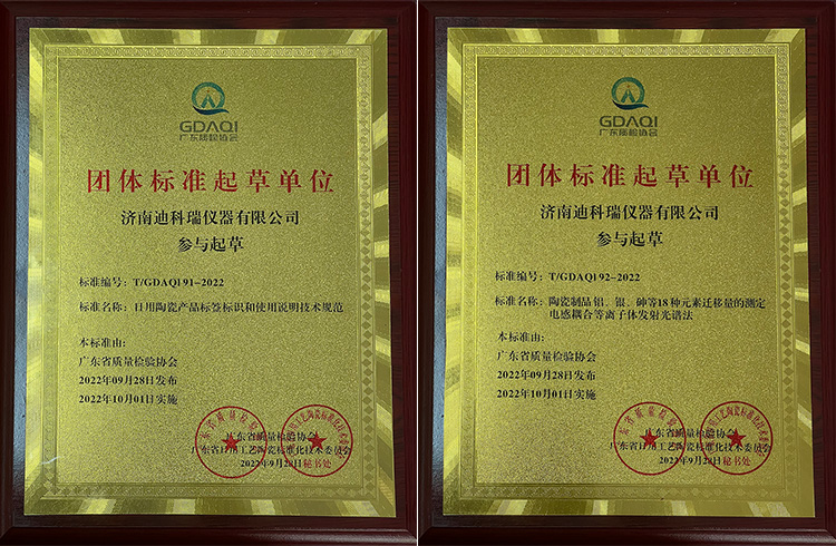 日前,由濟南迪科瑞儀器參與起草的《陶瓷制品 鋁、銀、砷等18種元素遷移量的測定電感耦合等離子體發射光譜法》、《日用陶瓷產品標簽標識和使用說明技術規范》兩項團體標準經廣東省質量檢驗協會發布,于2022年10月1日正式實施。