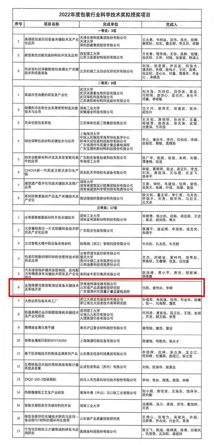近日2022年度包裝行業(yè)科學(xué)技術(shù)獎(jiǎng)勵(lì)管理委員會(huì)工作會(huì)議在線(xiàn)上召開(kāi),本年度共收到包裝行業(yè)科技獎(jiǎng)申報(bào)項(xiàng)目77項(xiàng),經(jīng)形式審查提交專(zhuān)家評(píng)審項(xiàng)目53項(xiàng)。經(jīng)專(zhuān)家評(píng)審,最終建議授獎(jiǎng)項(xiàng)目28項(xiàng)。由濟(jì)南迪科瑞儀器有限公司作為主要完成單位申報(bào)的《生物降解性能智能測(cè)試裝備關(guān)鍵技術(shù)及系統(tǒng)開(kāi)發(fā)》項(xiàng)目,獲得2022年度“包裝行業(yè)科學(xué)技術(shù)獎(jiǎng)”三等獎(jiǎng)。